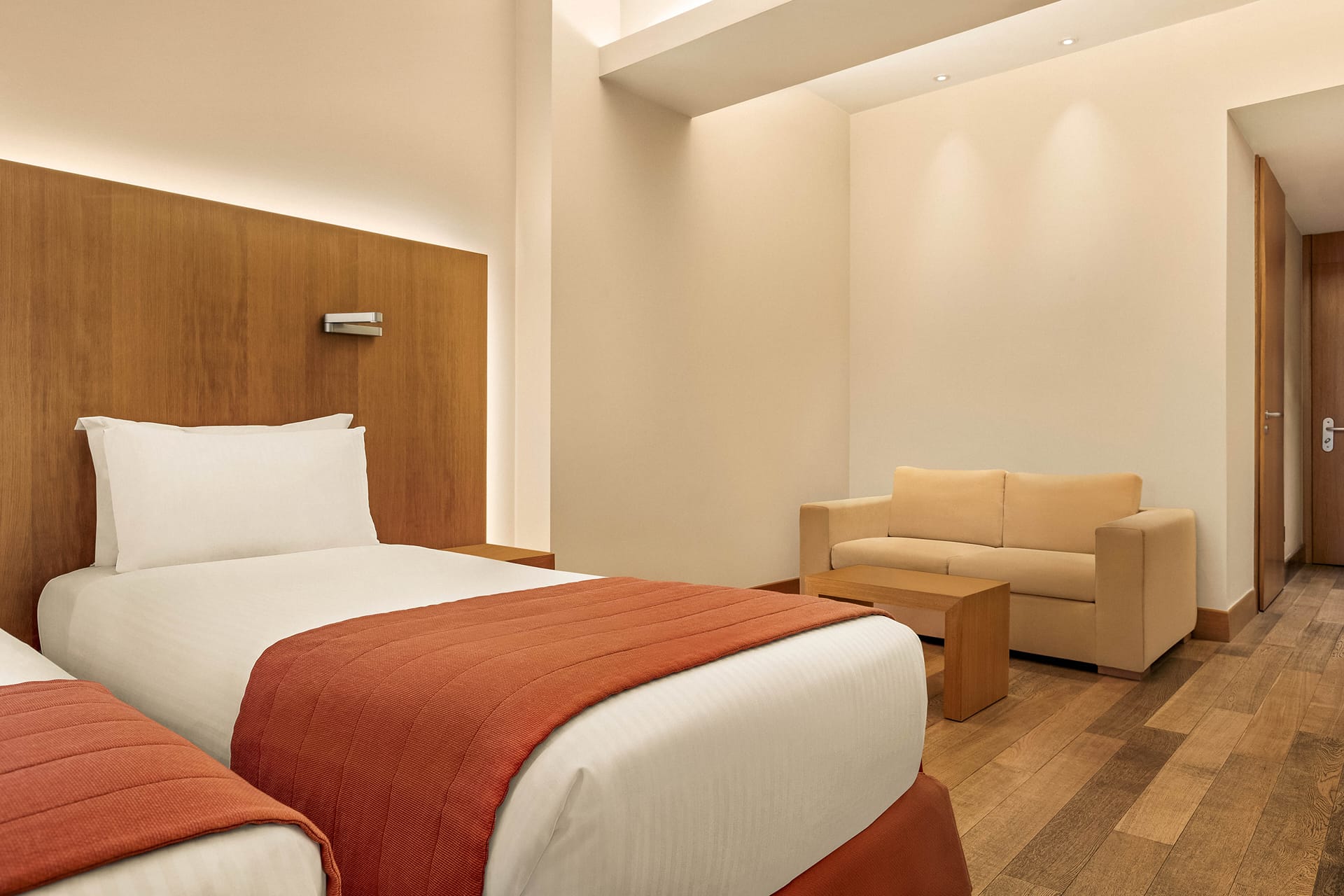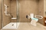 This type of room offers ample spaces and full functionality to guests with unique needs. It is 33 square meters in size and boasts easy, uninterrupted accessibility. The specially designed bathroom with shower adds to the overall user experience and provides smooth and cozy stay to all guests. Enjoy the choice of pillows that allows exceptional quality of sleep, as well as the anatomic mattresses and the modern furnishing of the room. Along with a plethora of amenities such as free Wi-Fi, LCD TV 32’’ and DVD upon request, room temperature control and branded toiletries, your stay at the hotel will definitely be memorable.